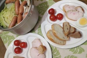 夕飯は、簡単ポトフに、自宅で作っておいた鶏ハムを段ボール箱で燻製。