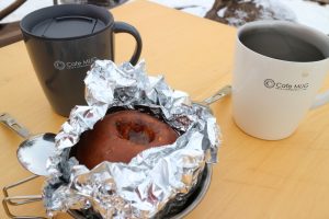 これまた昨晩食べ残しのベイクドアップルですが、シェラカップに入れて薪ストーブに置いておくだけで簡単に温められます。