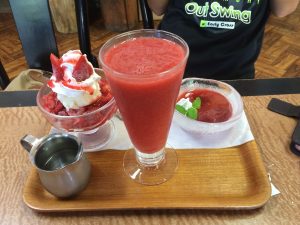 クラッシュストロベリーにするかイチゴジュースにするかイチゴプリンにするか決めかねてもの凄い悩んでいるので「全部いっちゃって良いよ♪」と言ったら喜んでました(笑