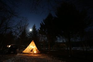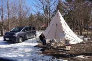 空腹も満たされてようやくチェックイン! キャンプ場に到着すると待望の雪は・・・