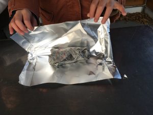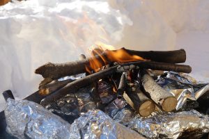 写真ではお芋の上に焚き火を乗せているように見えるでしょうが、お芋の下には熾火が敷き詰めてあります。