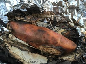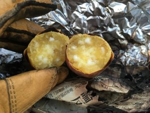 自分の場合は先に焚き火を楽しんで、良い感じで熾火になったらお芋を乗せる。