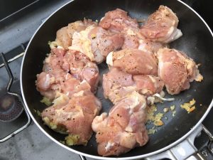 軽く熱したフライパン(スキレット)でバターを溶かしてニンニク・鶏肉を入れて炒めます。