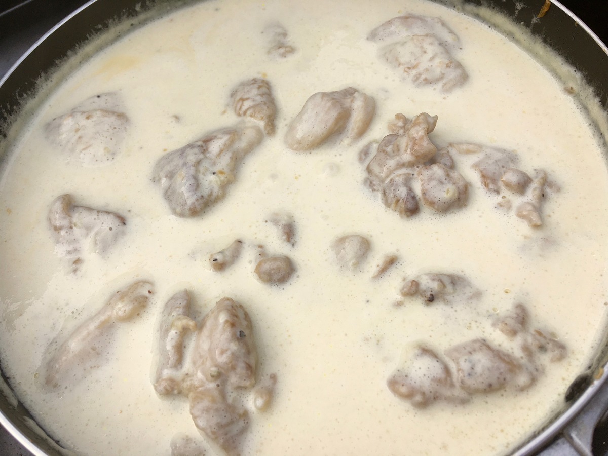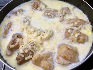 鶏肉に良い感じ焦げ目がついたら、牛乳・生クリーム・コンソメ・片栗粉をまぶしたチーズを投入します。