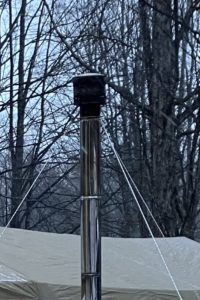 テントからどうやって煙突を出すかは、ケースバイケースですが我が家のテントはトリプルジッパーなので隙間を空けてそこから煙突を出すのが簡単です。