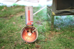 CB缶使用のユニフレーム コンパクトパワーヒーターUH-Cで少し体を温める。