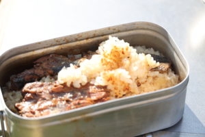 100均で買った鰯の蒲焼きを入れただけの炊き込みご飯をメスティンで炊いて朝食にする。