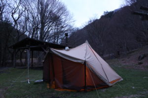 小川にかけられた橋を渡って荷物を運び込み、とにかく先ずはテントを設営